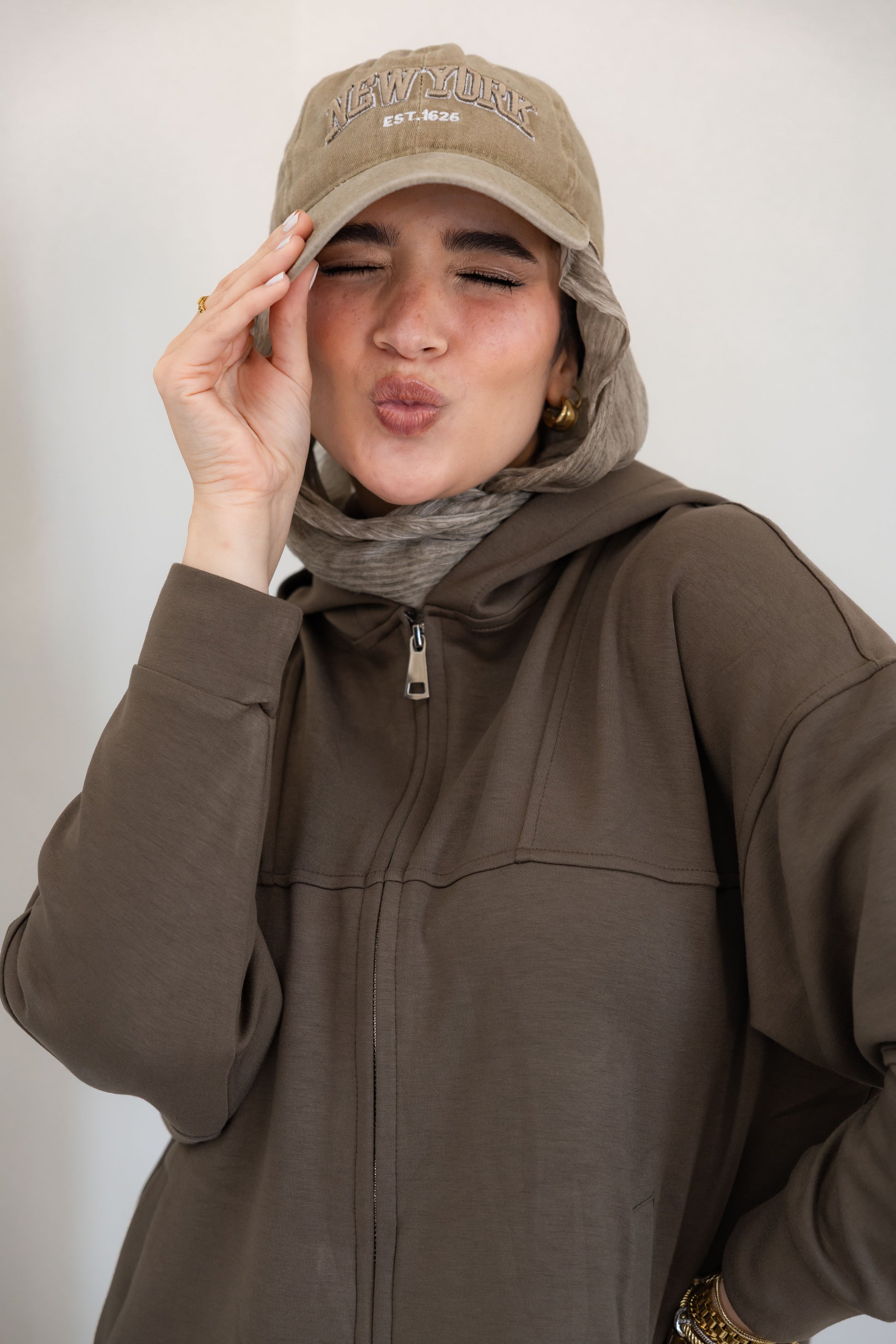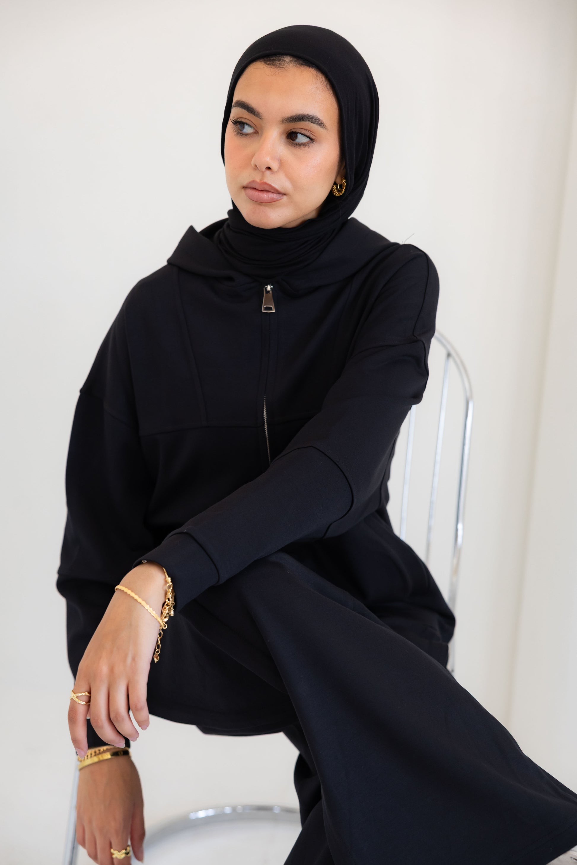 Stay warm, comfy, and stylish with our modest tracksuit, made from heavy jersey cotton fabric that feels very soft, cozy, and built for everyday wear. The relaxed fit keeps your look chic and modest, while the clean sporty lines add a fresh, athletic touch.